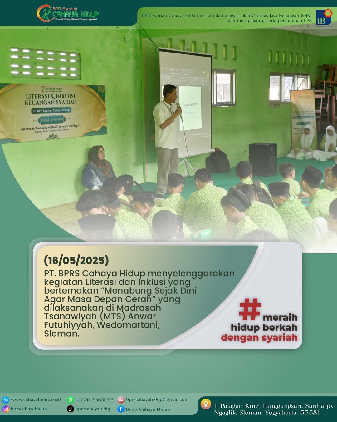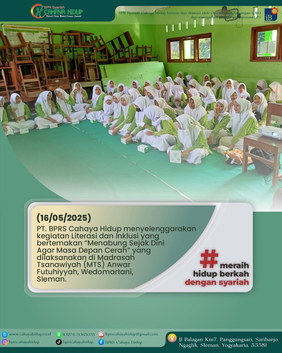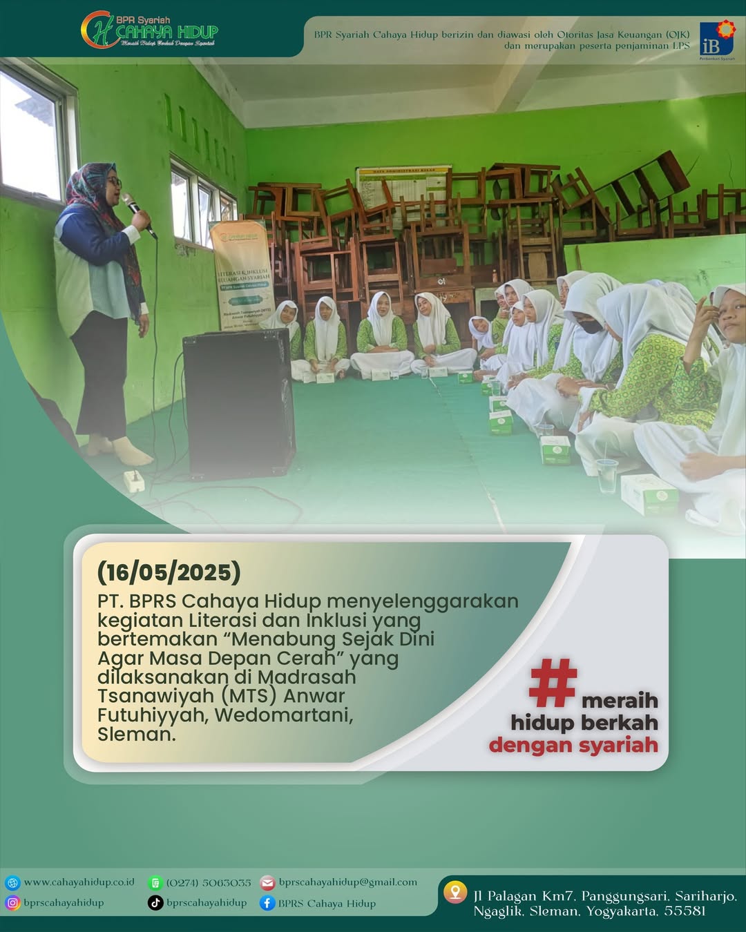PT. BPRS Cahaya Hidup menyelenggarakan kegiatan Literasi dan Inklusi yang bertemakan “Menabung Sejak Dini Agar Masa Depan Cerah” yang dilaksanakan di Madrasah Tsanawiyah (MTS) Anwar Futuhiyyah, Wedomartani, Sleman. berikut dokumentasi kegiatan Literasi & Inklusi Keuangan Syariah PT. BPRS Cahaya Hidup yang diadakan di MTS Futuhiyyah Sleman, pekan lalu.