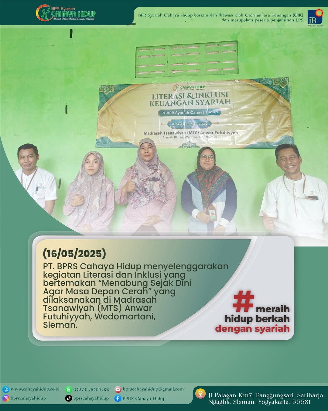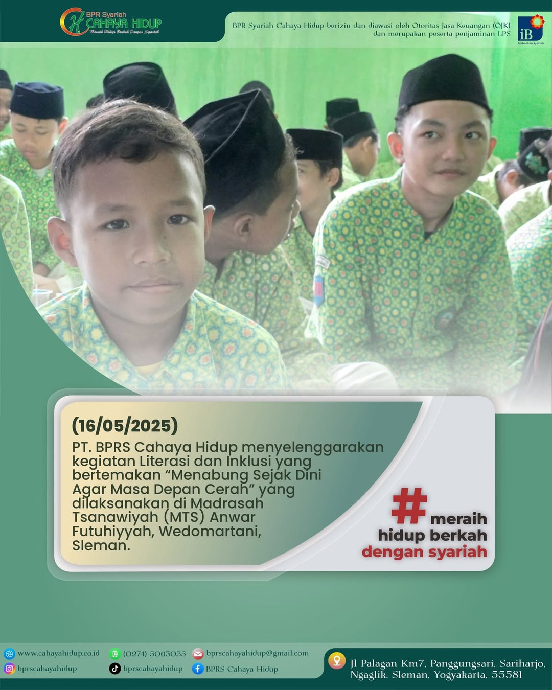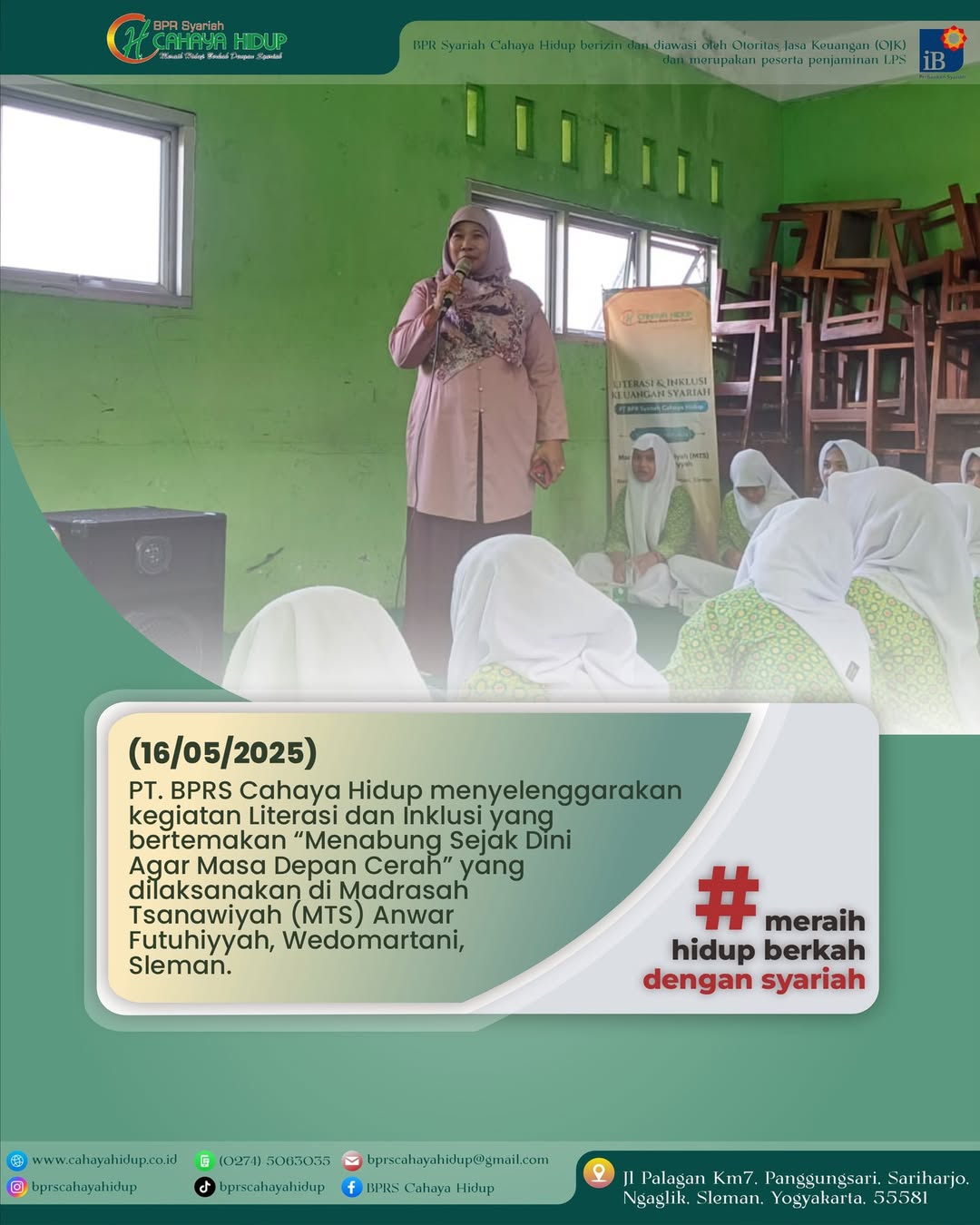 PT. BPRS Cahaya Hidup menyelenggarakan kegiatan Literasi dan Inklusi yang bertemakan “Menabung Sejak Dini Agar Masa Depan Cerah” yang dilaksanakan di Madrasah Tsanawiyah (MTS) Anwar Futuhiyyah, Wedomartani, Sleman. berikut dokumentasi kegiatan Literasi & Inklusi Keuangan Syariah PT. BPRS Cahaya Hidup yang diadakan di MTS Futuhiyyah Sleman, pekan lalu.